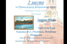 Поздравляем Звереву Татьяну, ученицу 11 класса МБОУ «Гимназия №3» - призера по Приволжскому федеральному округу Всероссийского конкурса детских рисунков «Моя Родина -2011», посвященный 20-летию новой России, в номинации «Я сам, я сама». Дальнейших творческих побед!