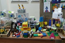Выставка "Наука и технология в творчестве младших школьников" привлекает внимание и малышей, и детей постарше. Преподаватели благодарны родителям за коллективное конструирование!