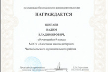 Шигаева Вадима (9Б класс) - призера Регионального этапа Всероссийской олимпиады школьников по курсу ОБЖ и преподавателя-организатора ОБЖ Сунгатуллина Ф.З.