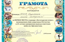 Команда МБОУ "Кадетская школа - интернат" в составе - Гафиятуллин Айрат, Зайков Илья, Закиров Линар, Андронов Александр, Сидоров Сергей, Юсупов Евгений под руководством воспитателя Тихонова В.В. заняли I место в турнире "Богатырские игры", посвященном Дню защитника Отечества и 25-летию вывода Советских войск из Афганистана.