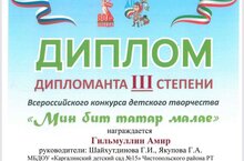 Поздравляем дипломанта III степени Всероссийского конкурса детского творчества «Мин бит татар малае» Гильмуллина Амира. Желаем дальнейших успехов!