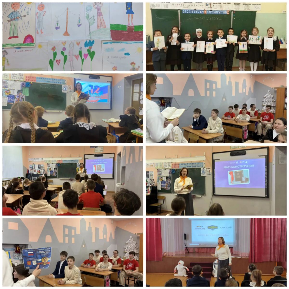 В рамках Дня Конституции Российской Федерации советником директора по воспитанию и взаимодействию с детскими общественными объединениями совместно с педагогическим коллективом были организованы и проведены следующие мероприятия: 1. Коллективно-творческое дело «Моя страна – Россия» для учащихся начальной школы. В рамках мероприятия участникам было предложено посмотреть вводный ролик о главном законе Российской федерации – Конституции. После просмотра - обсуждению в формате открытого диалога. По завершению обсуждения Орлята России изобразили то, как они поняли материалы видеоролика и беседы с Советником/учителем. 2. Интеллектуальная игра «Что мы знаем о Конституции?» с учащимися 5-8 классов, в ходе которой участники смогли в игровой форме обобщить и систематизировать знания об основах конституционного строя Российской Федерации.