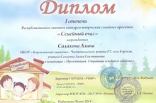 Салахова Алина, ученица 8В класса, награждена Дипломом I степени Республиканского заочного конкурса творческих семейных проектов "Семейный очаг" в номинации "Презентация. Страницы семейного альбома". (Рук.Салахова Л.Г., учитель истории). Молодец!