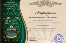 Ахтямзянова Лилия Габдулловна, учитель татарского языка и литературы, награждена Дипломом победителя III степени за победу в мероприятии Всероссийского конкурса профессионального мастерства "Я - учитель" в номинации "Методические разработки". Молодец!