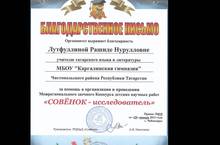 Подведены результаты Межрегионального Конкурса детских научных работ "Совёнок-исследователь". По итогам данного конкурса наши учителя: Лутфуллина Р.Н., Ахтямзянова Л.Г., Салахова Л.Г. награждены благодарственными письмами за помощь в организации и проведении данного конкурса. Молодцы!