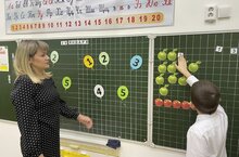Учитель-дефектолог Фомина Галина Николаевна провела урок математики в 1А классе на тему: «Число и цифра 6». Цели урока: формирование представлений о числе шесть, понимание разницы между числом и цифрой; развитие навыков прямого и обратного счета; освоение состава числа шесть. Урок начался с организационного момента, когда учитель проверила готовность учащихся к уроку и создала благоприятную атмосферу для дальнейшей работы. На этапе актуализации имеющихся знаний педагог предложила большое разнообразие ярких интересных заданий: прямой и обратный счет до 10 с использованием числового ряда, счёт через хлопок, назови соседей числа, соотнеси цифру с количеством предметов. Бурю эмоций вызвала игра «Найди нужную цифру». Учащиеся бумажной ладошкой ударяли по шарикам с цифрами, которые называл учитель. Основная часть урока включала в себя знакомство с числом и цифрой шесть. Учащиеся с помощью учителя определили на что похожа данная цифра (свисток, замок, червячок в яблоке), нашли цифру шесть среди других цифр на картинке, написали цифру в тетради. Самый сложный этап урока (решение примеров в пределах шести) педагог умело организовала с помощью наглядного материала (красных и зеленых яблок). Урок получился ярким и эмоциональным.