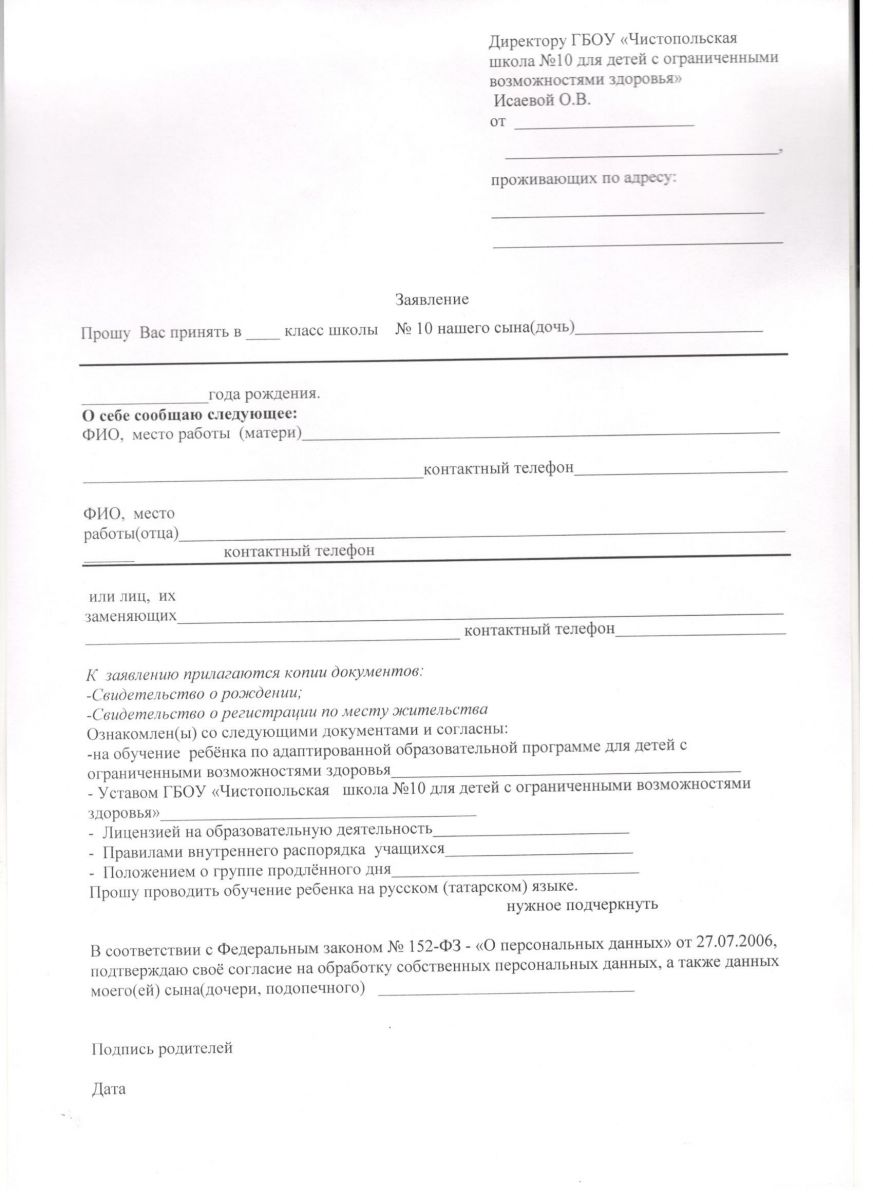 Заявления о приеме в школу и зачисление ребенка производится на основании письма от Министерства образования и науки Республики Татарстан - список учащихся с рекомендацией для обучения в образоваьтельной организации для детей с ограниченными возможностями здоровья по результатам обследования Республиканской психолого-педагогической консультации.