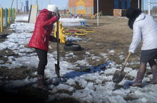 Раскидывание и рыхление снега на участке детского сада.