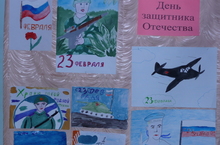 В оформлении выставки рисунков "День защитника Отечтества" приняли участие учащиеся 1, 5, 6 класса под руководством Падериной Нины Арсентьевны.