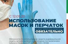 Уважаемые родители и ученики. Мы напоминаем вам, что согласно постановлению Кабинета Министров РТ необходимо оязательно надевать маски и перчатки. Согласно документу, гражданам в РТ с 12 мая запрещен вход и нахождение в объектах розничной торговли, в общественном транспорте без использования масок и перчаток. За неисполнение данных мер предусмотрены штрафные санкции.