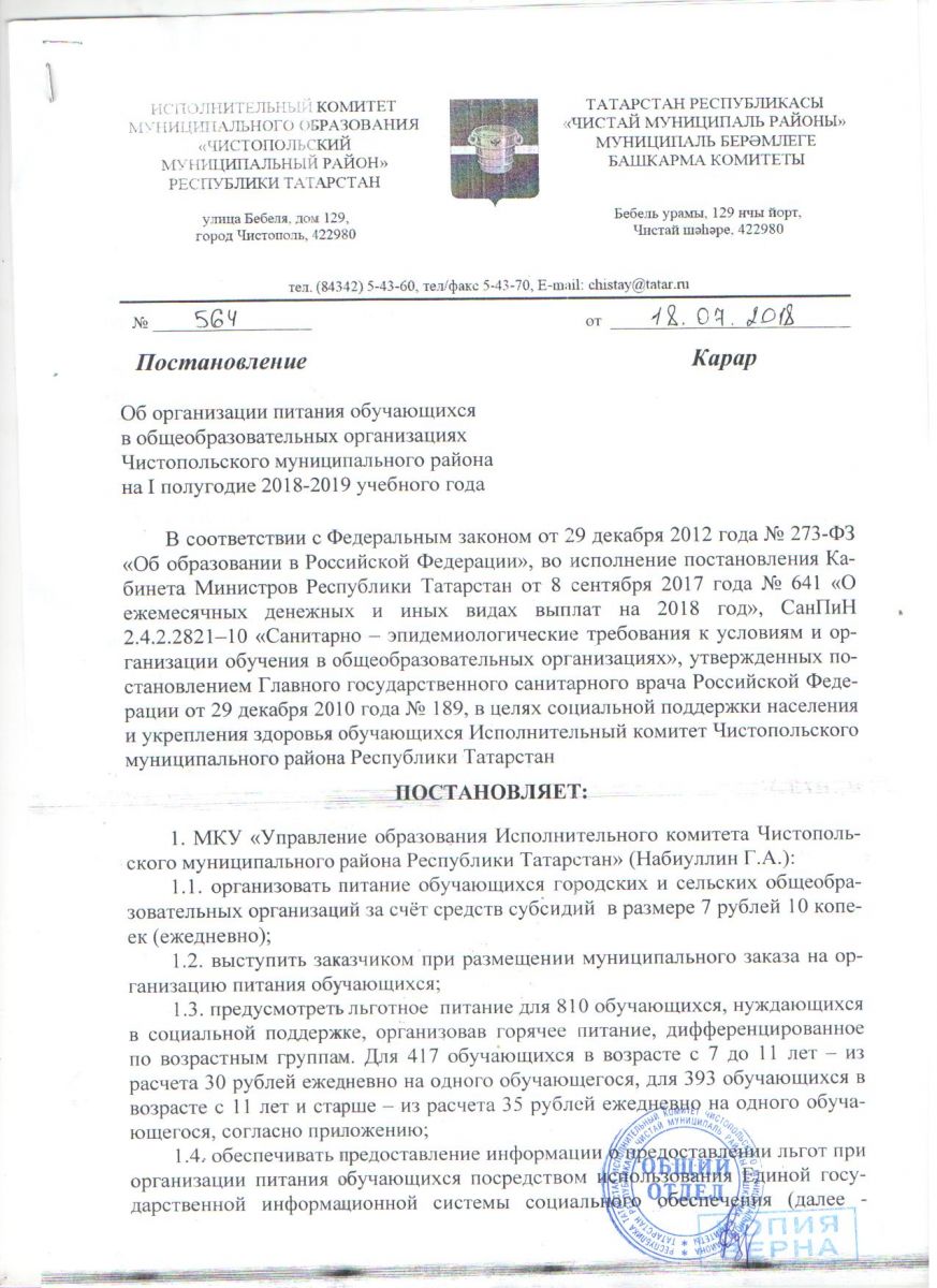 Постановление Исполнительного комитета ЧМР РТ об организации питания учеников 5-11 классов в ОО