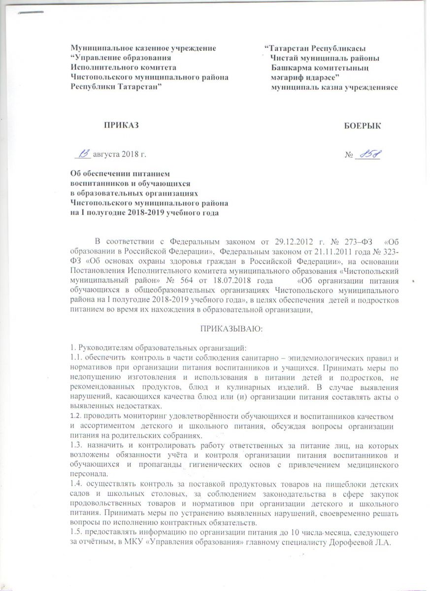 Приказ МБОУ "Красноярская ООШ" об организации питания