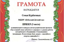 Семья нашего воспитанника Курбатова Савелия учавствовала в муниципальном конкурсе детско-родительскоих проектов "Как в семье заботяться о здоровье" и заняли почетное 3 место.