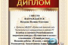 Воспитанница Наурова Полина, приняла активное у частие в Республиканском творческом конкурсе "Путешествие в космос" и заняла 2 место.