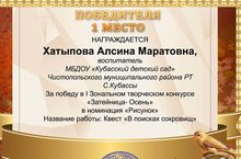 Наш педагог Хатыпова А.М. стала победителем в зональном творческом конкурсе “Затейница-Осень” в номинации “Рисунок”.Поздравляем! Безнең педагог Хатыпова А. М. "Затейниуа-осень" зона иҗат конкурсында "Рәсем" номинациясендә җиңүче булды.Котлыйбыз -