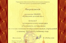 Коллектив МБДОУ "Кубасский детский сад" награжден дипломом призера мунициапльного конкурса "Готовность лучше всех" по итогам готовности образовательных учреждений к новому 2017-2018 учебному году./Муниципаль бюджет мәктәпкәчә белем учреждениесе"Кубасс балалар бакчасы" коллективы мәгариф учреждениеләренең яңа 2017-2018 уку елына әзерлек йомгаклары буенча «Әзерлек барсыннан яхшырак» дип аталган призер дипломы белән бүләкләнде.