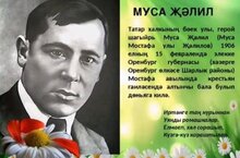 Сегодня прошло мероприятие по случаю 117-летия со дня рождения великого татарского поэта-героя Мусы Джалиля.Учитель родного языка Сафиуллина Г.Р. провела литературный час «Символ чести и мужества», посвящённый татарскому писателю М. Джалилю. С помощью слайд-презентации "Его песня борьбы…" ребята узнали о суровых фронтовых буднях поэта, о страшном времени, проведенном в фашистских застенках концлагерей, в которых единственным оружием Мусы Джалиля были его стихи.
