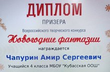 Ученик 4 класса, Чапурин Амир. Диплом призера " Новогодние фантазии" стихотворение "Дед Мороз".