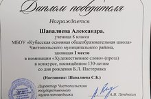 Ежегодный республиканский музейный конкурс на лучшее исполнение произведений Б.Л. Пастернака "ЦЕЛЬ ТВОРЧЕСТВО - САМООТДАЧА "Диплом победителя (1 место ) в номинации "Художественное слово" наградили Шавалиеву Александру, ученицу 8 класса.