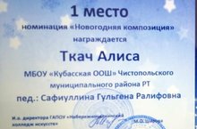 9 нчы сыйныф укучысы, Ткач Алисә, "Яңа ел композициясе" номинациясендә 1 нче урын алды (җитәкчесе Сафиуллина Г. Р.)