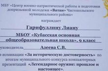 МБУ "Центр военно - патриотической работы и подготовки допризывной молодежи "Ватан"" Чистопольского муниципального района награждает Гарифулину Лиану грамотой в номинации "За творческое решение" и "За историческую достоверность".