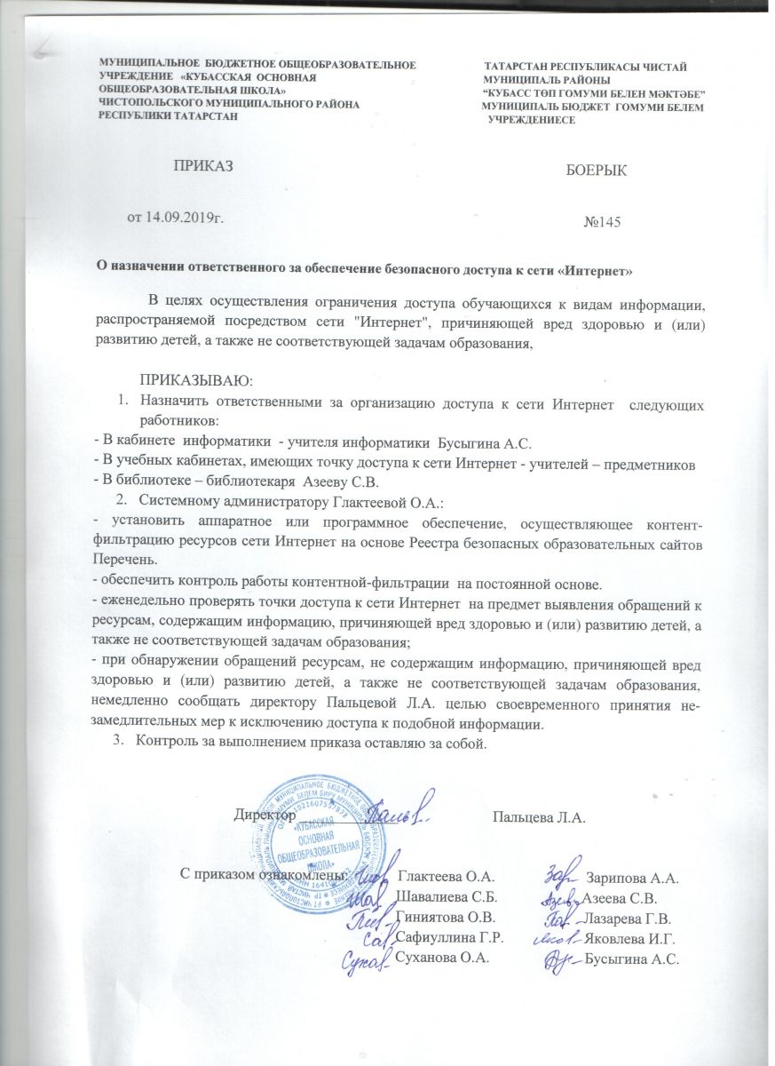 Приказ о назначении ответственного за обеспечение безопасного доступа к сети Интернет