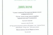 Учитель родного языка и литературы - Фасхетдинова Лилия Марсельевна на Всероссийской научно-исследовательской конференции “По следам Алиша” выступила с докладом на тему “Создание положительной мотивации на уроках родного языка и литературы" и была награждена дипломом. Её работа вошла в сборник тезисов IX Всероссийской научно-практической конференции” по следам Алишера Навои".