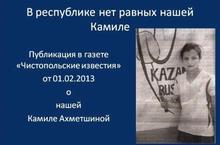Читайте статью Гульнур Садыковой о нашей Камилле Ахметшиной, ученице 7 В класса. Статья была опубликована 1 февраля 2013 года в газете "Чистопольские известия".