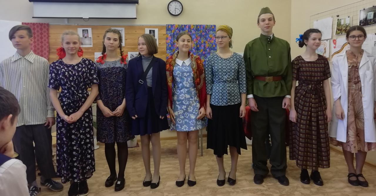 10 мая в 7Б класс были приглашены большие гости: труженица тыла - Корнева Вера Михайловна, дитя войны - Завьялова Лидия Ивановна, обе женщины - вдовы участников Великой Отечественной войны. На мероприятие были приглашены и родители нашего класса. Ребята приготовили и показали подарок: спектакль, посвящённый женщинам и детям войны "Просто ты умела ждать...". Когда закончился спектакль, Лидия Ивановна сказала: "Всё так и было..." Спектакль тронул всех присутствующих. Затем наши гостьи рассказали о себе, о трудной жизни в военные годы. Вера Михайловна работала на эвакуированном в Чистополь часовом заводе. Лидия Ивановна с мамой, с сестрой и братом переехали в 1941 году из Горьковской области в Чистополь , ближе к родине отца, который был в то время на фронте. Училась в школе. Семья жила очень тяжело. Женщины рассказали и о своих мужьях, ветеранах Великой Отечественной войны.