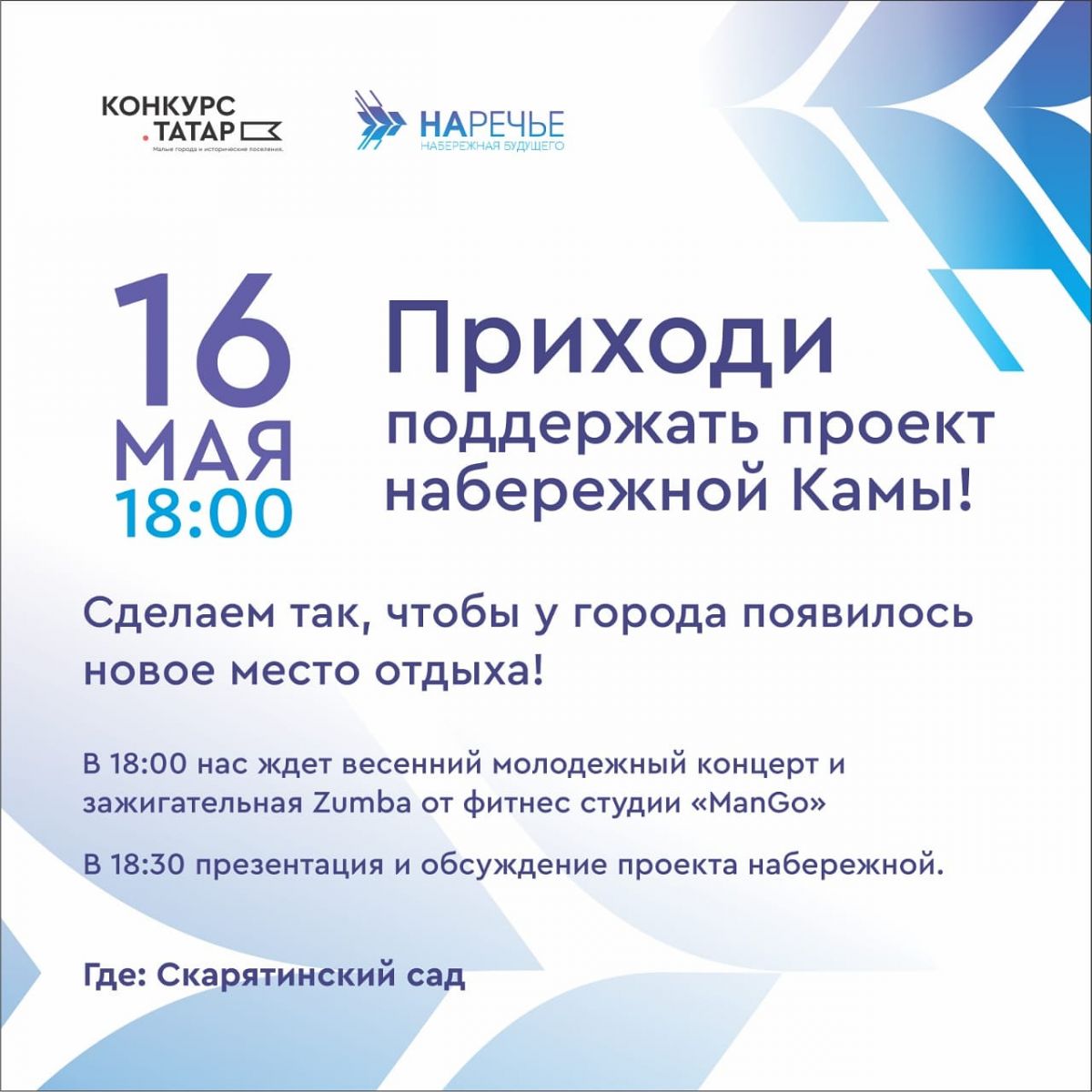 Опубликовано: 15.05.2021Приглашаем учителей, лицеистов и родителей поддержать проект набережной Камы 16 мая в Скарятинском парке. В 18.00 вас ждет весенний молодежный концерт и зажигательная Zumba от фитнес студии "ManGo". В 18.30 презентация и обсуждение проекта.