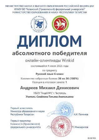 Опубликовано: 29.08.2021Летние каникулы - самые долгожданные каникулы для каждого школьника! Но наши лицеисты - школьники особенные: потребность в приобретении знаний у них не исчезает и во время отдыха. Вот, например, ученик 6 Б класса Миша Андреев, участвуя в республиканских онлайн-олимпиадах КФУ "WINKID" стал дважды (!!!) абсолютным победителем, набрав максимальные баллы на олимпиадах по математике и русскому языку! Миша, ты настоящий лицеист!)
