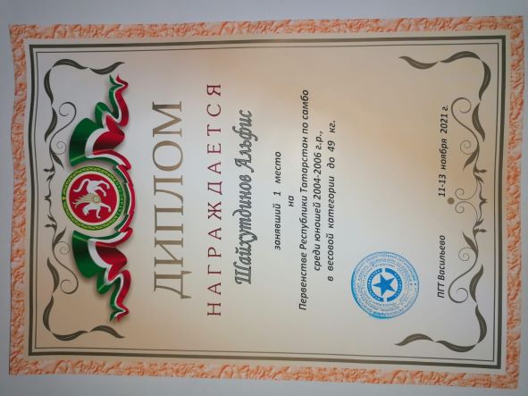 Опубликовано: 13.11.2021Поздравляем Шайхутдинова Альфиса с победой в Первенстве Республики Татарстан по самбо.среди юношей 2004-2006гр.