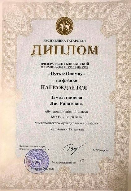 Опубликовано: 15.01.2022Поздравляем Лию Замалетдинову, ученицу 11 класса, и её учителя Гульназ Ниязовну Гилязову с ПРИЗОВЫМ МЕСТОМ в заключительном этапе республиканской олимпиады школьников по ФИЗИКЕ «Путь к Олимпу»! Молодцы! Новых вам побед!!!