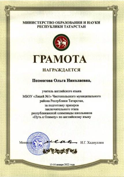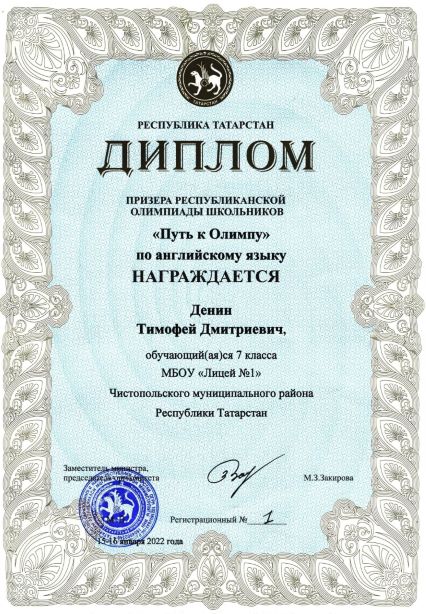 Опубликовано: 19.01.2022Тимофей - призёр республиканской олимпиады! Поздравляем Тимофея Денина, ученика 7 класса, и его учителя Ольгу Николаевну Позмогову с ПРИЗОВЫМ МЕСТОМ в заключительном этапе республиканской олимпиады школьников по АНГЛИЙСКОМУ ЯЗЫКУ «Путь к Олимпу»! Молодцы! Новых вам побед!!!