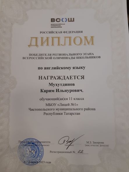 Опубликовано: 11.02.2023Мухутдинов Карим, победитель регионального этапа всероссийской олимпиады школьников по английскому языку.
