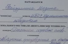 Поздравляем нашу юную ученицу - победителя зонального фестиваля "Шенталинские чтения-2019" Мадину Файзуллину. Руководитель - учитель истории Л.Н.Сафиуллина. Желаем новых побед!
