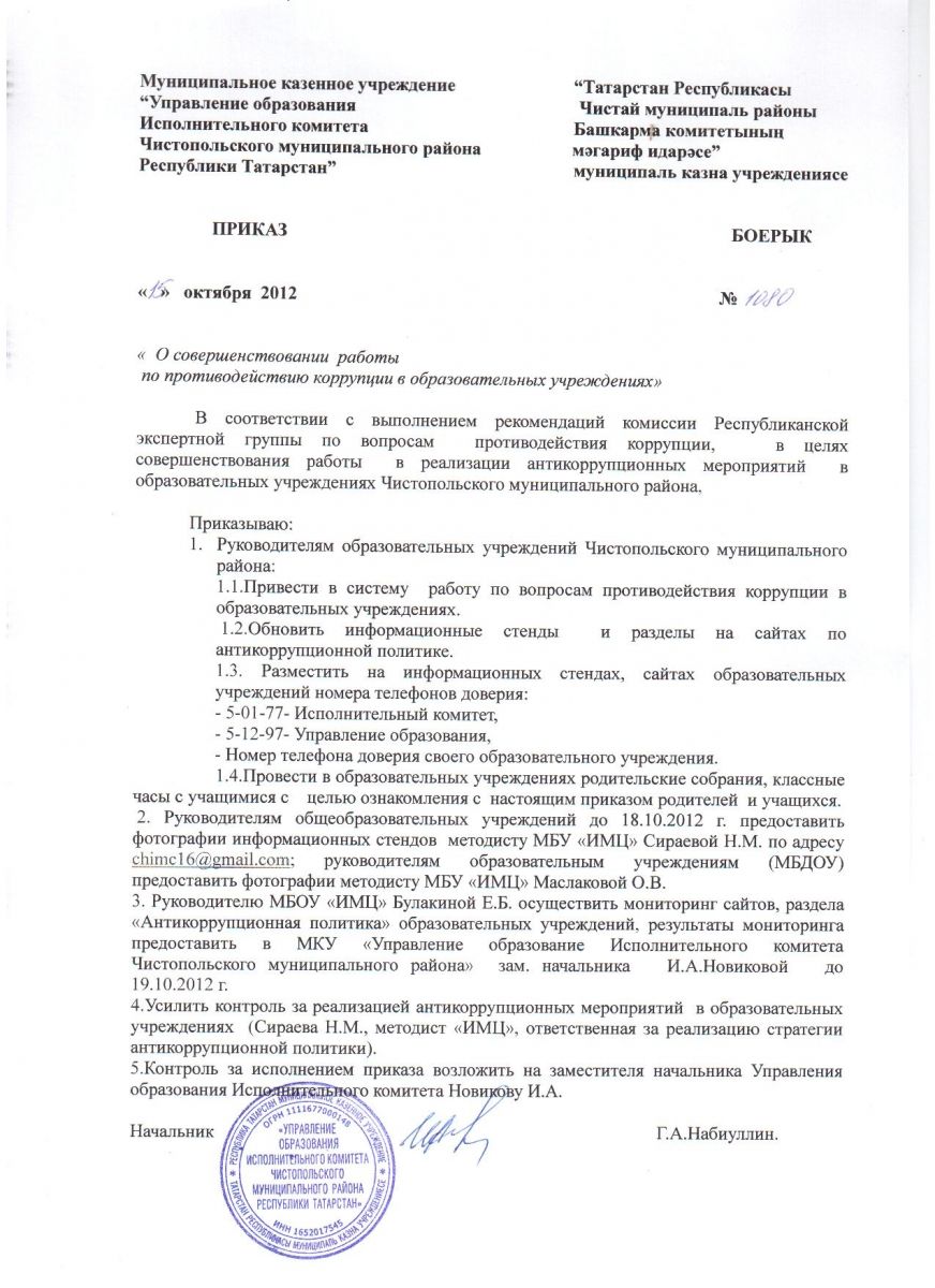 Приказ УО от 15.10.2012 г. No. 1080 по ЧМР