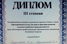 Поздравляем с победой!!! Студентки 531 группы Бадалбоева Р. и Мартьянова Н.под руководством преподавателей экономических дисциплин Ивановой Е.И. и Нуретдиновой Н.С. заняли 3 место в Республиканском конкурсе студенческих проектов и бизнес-планов"Предпринимательство, как один из факторов развития сельского хозяйства и промышленности" среди обучающихся ПОО Республики Татарстан.