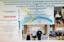 Студентка 531 группы Мартюшина Светлана , под руководством преподавателей экономических дисциплин Нуретдиновой Н.С., Барсовой В.И., Ивановой Е.И. ,стала победителем в номинации "Лучший теоретик" в III Республиканском конкурсе среди студентов ПОО Республики Татарстан "Лучший менеджер" по укрупненной группе специальностей 38.00.00 Экономика и управление,который был организован и проведен на базе ГАПОУ "Казанский торгово-экономический техникум".