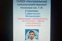 Студент 141 группы Сафин Булат принял участие в Республиканском конкурсе в сфере добровольчества (волонтерства) «Добрый Татарстан – 2020» в номинации «Доброволец (волонтер) с сфере событийного направления». На рассмотрение совета Экспертов предоставлено электронное портфолио в презентационном формате, которое включало в себя следующие материалы: дипломы, благодарственные письма, грамоты, сертификаты, подтверждающие деятельность и достижения конкурсанта; рекомендательные письма, отзывы.