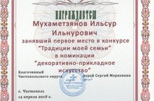 Чистопольском благочинии Чистопольской епархии прошло награждение победителей конкурса «Традиции моей семьи», направленный на повышение роли и значимости семьи, распространение положительного опыта семейных отношений, сохранение семейных традиций, духовно-нравственного воспитания молодежи, а также в рамках реализации благотворительной работы. Проводился конкурс по трем возрастным группам в четырех номинациях: «Декоративно – прикладное искусство», «Рисунок», «Литературное творчество» и «Фотография». Студент 331 группы Чистопольского сельскохозяйственного техникума Мухаметзянов Ильсур (кл. рук. Гарифуллина А.А.) занял 1 место в номинации «Декоративно прикладное искусство». Поздравляем победителя!