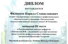 Студент 111 группы Филиппов Кирилл, под руководством Рыбиной Натальи Павловны, занял III место в Республиканском конкурсе рефератов «Лобачевский Н.И.- выдающийся русский математик»