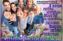 День молодёжи – самый замечательный праздник. Сколько новых открытий и достижений у вас впереди. Примите искренние поздравления и пожелания всего наилучшего в этот день. Пусть надежда, вера и любовь всегда сопутствует вам. Пусть нотки грусти никогда не прокрадутся в ваши души. Веселитесь, радуйтесь, ведь вы молоды. Будьте всегда энергичными и уверенными в себе. Желаем вам по жизни прекрасных друзей. Пусть ваша молодость бьёт энергичным ключом через край, пусть неиссякаемый источник ваших знаний откроет вам все пути к интересной и занимательной жизни. Стремитесь, развивайтесь, не отступайте от своей цели. Будьте достойным поколением своих потомков!