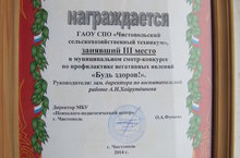Студенты и сотрудники ГАОУ СПО «Чистопольский сельскохозяйственный техникум» приняли участие в муниципальном смотр – конкурсе «Будь здоров!» в рамках недели профилактики наркомании и других негативных явлений среди студенческой молодежи, конкурс стартовал с 1 октября 2014 года и продолжался весь ноябрь месяц.