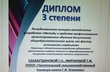 Преподаватели Чистопольского сельскохозяйственного техникума Сахабутдинова Гульнара Наисовна и Миронова Татьяна Жановна, предоставили разработку практического учебного занятия по общеобразовательной дисциплине естественно-научного направления. По итогам конкурса данная разработка заняла 3 призовое место.