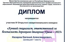Поздравляем заместителя директора по общим вопросам и обеспечению безоапасности Назарова Е.А. занявшего 1 место во IV Открытом межрегиональном конкурсе «Лучший специалист, ответственный за безопасность дорожного движения Урала – 2023».