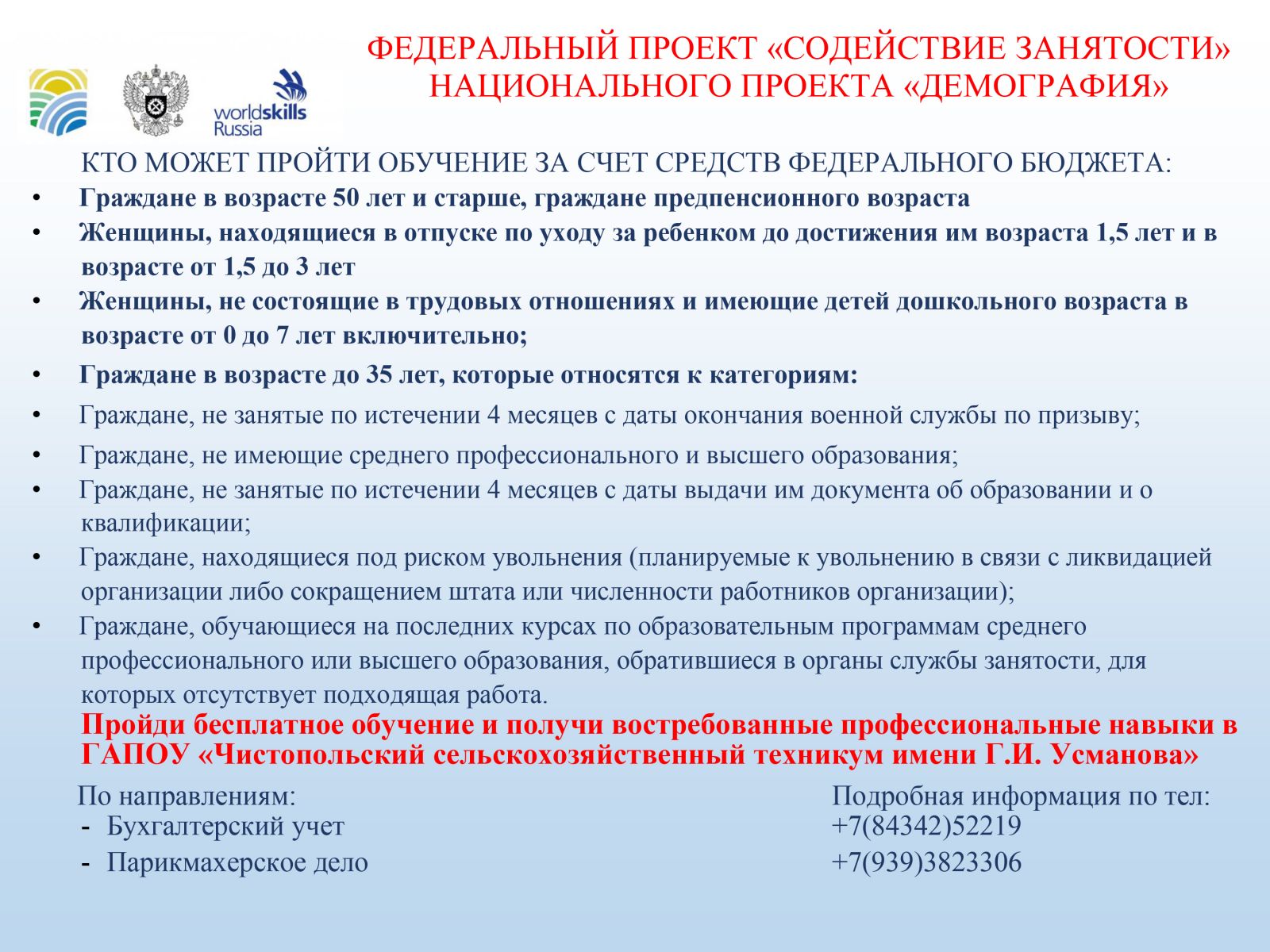 ФЕДЕРАЛЬНЫЙ ПРОЕКТ «СОДЕЙСТВИЕ ЗАНЯТОСТИ» НАЦИОНАЛЬНОГО ПРОЕКТА «ДЕМОГРАФИЯ»