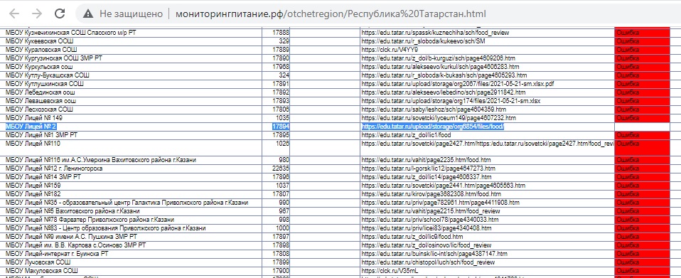 Ссылка на страницу с меню: https://edu.tatar.ru/chistopol/org6854/food. Ссылка для автоматического мониторинга питания: https://edu.tatar.ru/upload/storage/org6854/files/food/. Скриншот с результатами автоматического мониторинга питания (код школы 17894) |