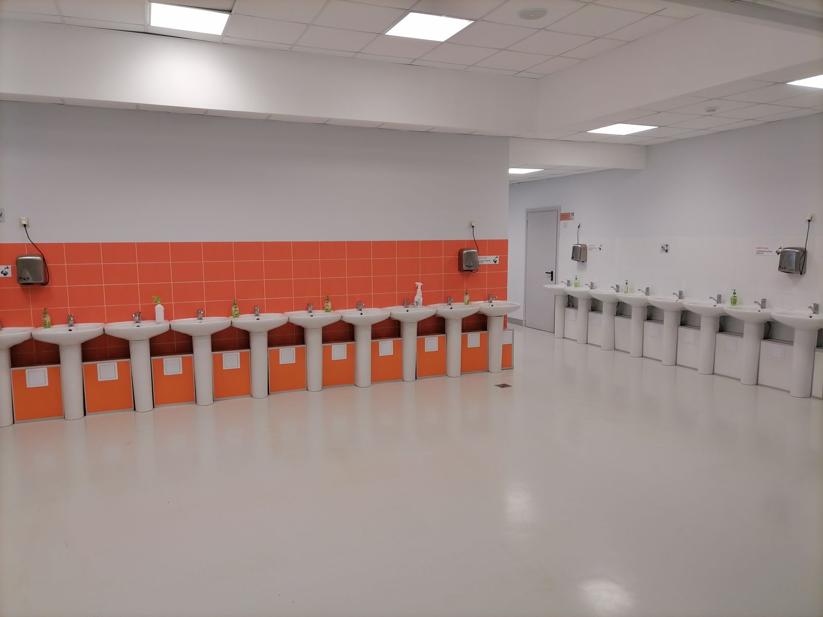 Перед входом в столовую установлены раковины в количестве 18 штук, жидкое мыло с дозатором, электрополотенца |