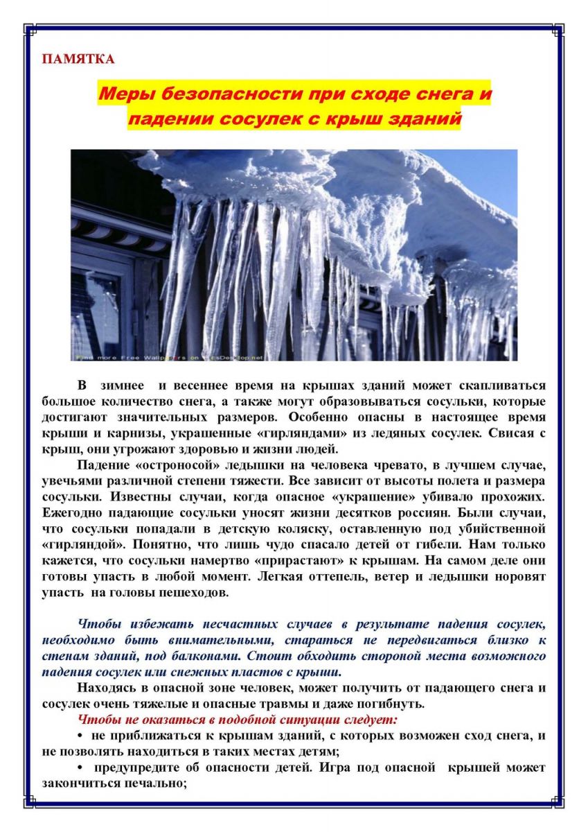 Меры безопасности при сходе снега и падении сосулек с крыш зданий